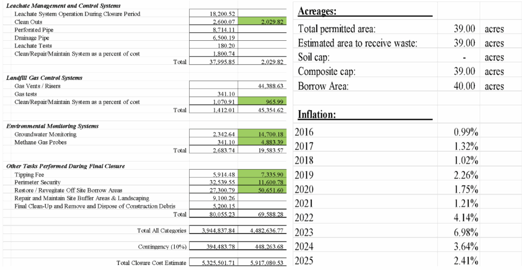 • Ensolum staff then created calculation worksheet tables for closure and post-closure calculations, input the information received, and calculated costs for all landfill categories. In addition, Ensolum staff provided Life of Site calculations from engineering formulas and waste tonnage information.